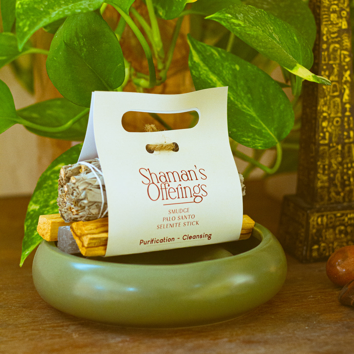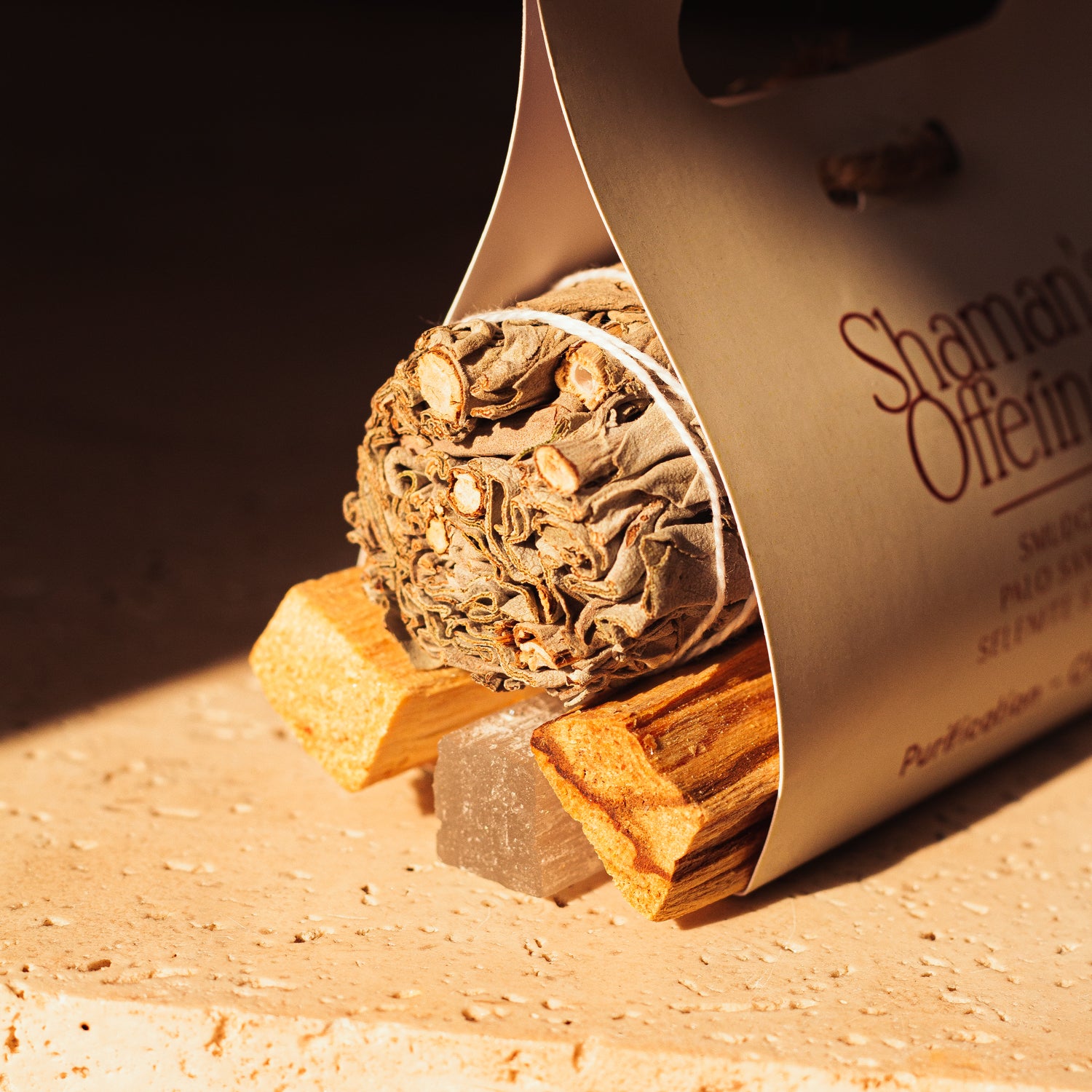 SAGE - PALO SANTO - ABALONE SHELL An ancient practice from the Native American culture, that utilizes natural materials to eliminate negative energy and encourage positivity. The fragrant smoke from burning the Sage leaves Palo santo takes you a step closer to connecting with your surroundings and revitalize your energies.